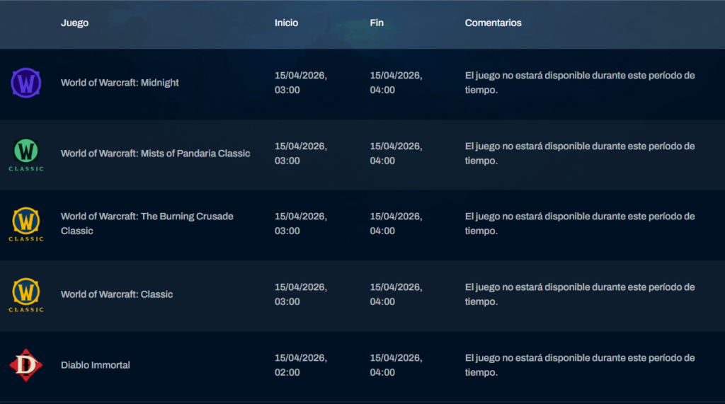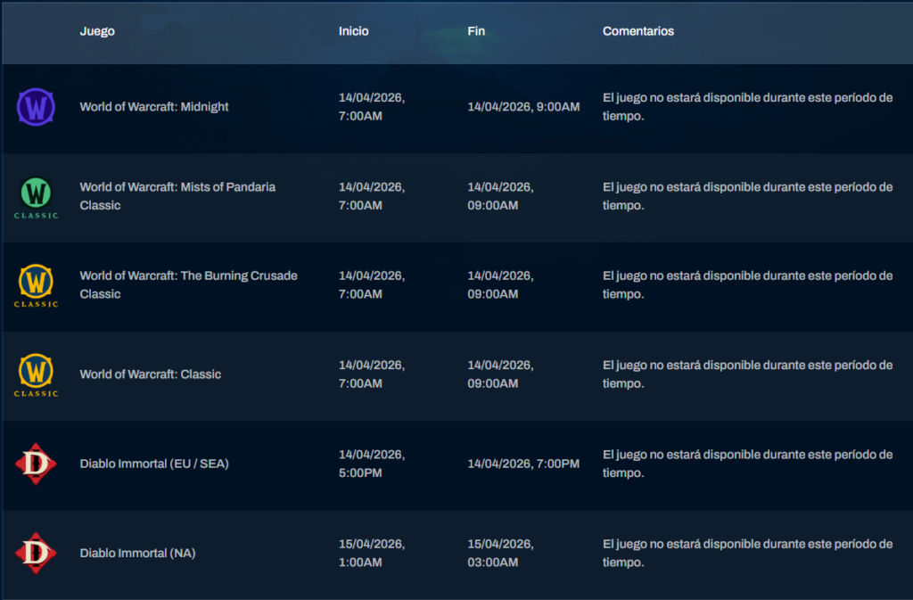 A continuación, os traigo el mantenimiento semanal para Europa y para América. Los Horarios están distribuidos según su zona local.
