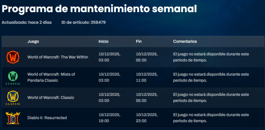 Publicado enWorld of Warcraft Horario mantenimiento Blizzard Publicado por Myd 12/07/2025Publicado enWorld of WarcraftA continuación os dejo el horario de mantenimiento de esta semana, tanto para Europa como para América.Mantenimiento semanal para EuropaMantenimiento semanal para América Myd Ver todas las entradasNavegación de entradasEntrada anterior Guía Housing: ¿Cómo conseguir una tabla de quesos para tu casa?Siguiente entradaDuskbrute Harrower podría convertirse en la montura más versátil de la expansión Midnight