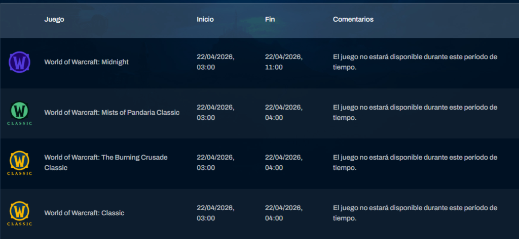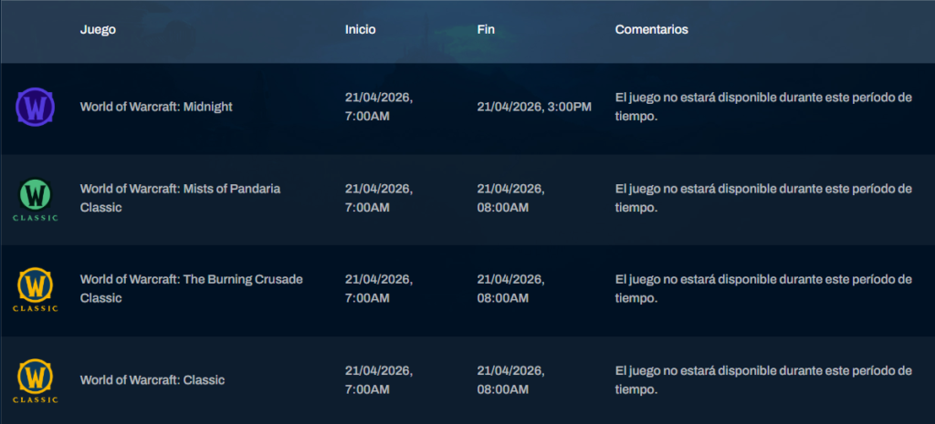 A continuación, os traigo el mantenimiento semanal para Europa y para América. Los Horarios están distribuidos según su zona local.